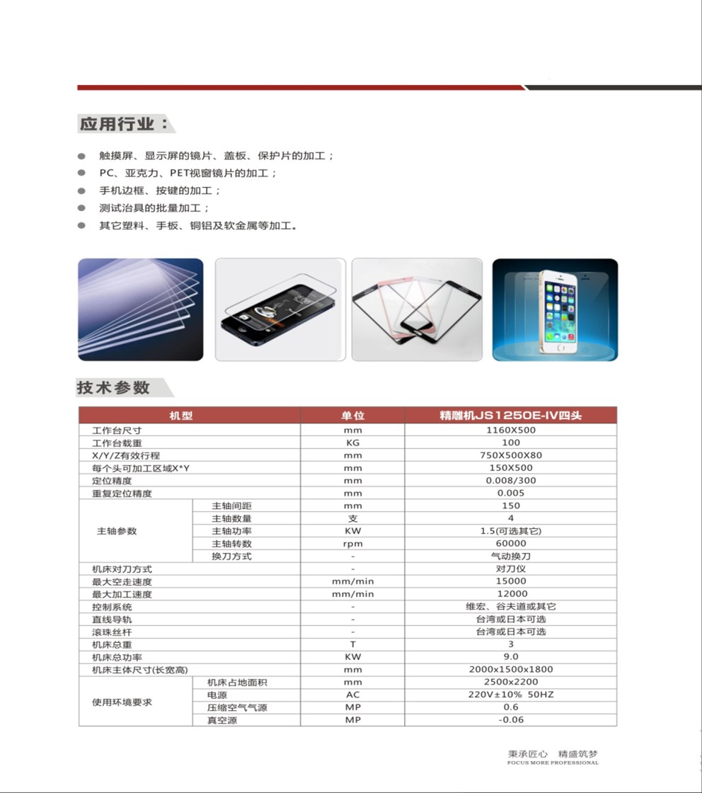 簡介—— 四頭精雕機應用行業(yè):1.觸摸屏、顯示屏的鏡片、蓋板、保護片的加工;2.PC、亞克力、PET視窗鏡片的加工;3.手機邊框、